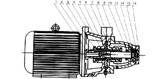 泵體4與電機法蘭連接,泵軸8裝在電機軸頭上是動配合,鍵2在鍵槽內(nèi)可自由滑動。